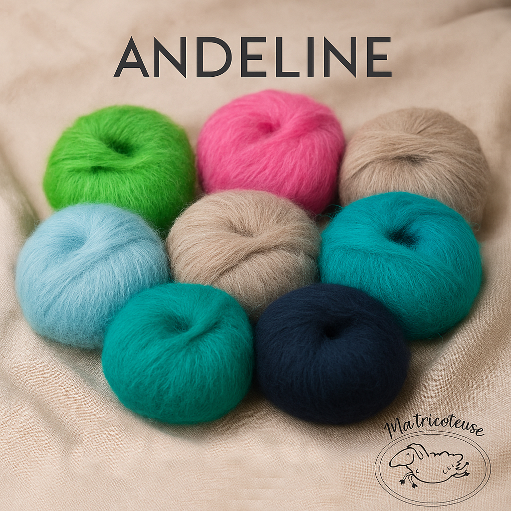 La pelote Andeline pèse 25 g pour 210 m ; composée de 72 % d’alpaga, 28% Polyester, elle se tricote aux aiguilles n°4, en simple ou double fil.